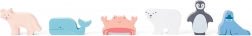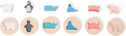 Ez a minőségi fa formaberakó egyszerre nyújt szórakozást és tanulást. Az állatkák – fóka, jegesmedve, rák, pingvin, róka és kardszárnyú delfin – színes, kör alakú zsetonokba illeszkednek körvonal-kivágással, azonos színnel, ami megkönnyíti a tájékozódást és erősíti a színek és formák felismerését.