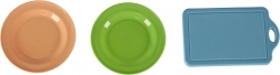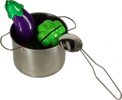 Ez a sokoldalú gyermekkészlet élelmiszerekkel és edényekkel valósághű főzést kínál a játékkonyhában. Az egyes gyümölcs- és zöldségdarabok részekre válnak szét, és „felszeletelhetők” a biztonságos műanyag késsel a vágódeszkán. A fémlábasok, serpenyő, szűrő és tányérok tovább fokozzák az élmény hitelességét.