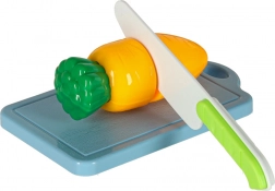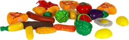 A gyümölcsök és zöldségek részekre válnak szét tépőzár/mágnes segítségével, a gyerekek biztonságosan szeletelhetik műanyag késsel és tálalhatják a tányérokon.