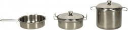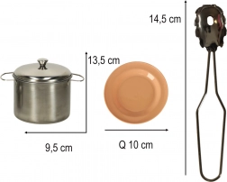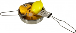 A készlet része a fedős lábas és a serpenyő fémből, amelyek autentikus élményt adnak a főzős szerepjátékhoz.