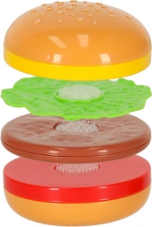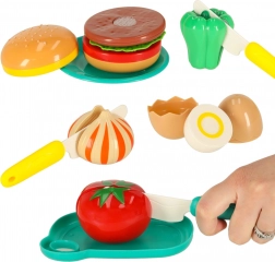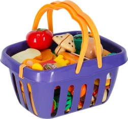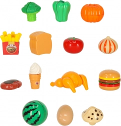 Színes műanyag ételkészlet gyerekeknek, amely fejleszti a finommotorikát, a főzéssel kapcsolatos ismereteket és a kreatív szakácsjátékot. Az elemek tépőzárral kapcsolódnak, így az ételek „felszeletelhetők” a biztonságos műanyag késsel, majd újra összeilleszthetők. A készlet tartalmaz tálcákat, tányérokat és gyerek evőeszközöket, minden pedig egy praktikus, fogantyús kosárban kap helyet az egyszerű hordozás és tárolás érdekében.