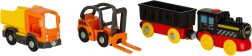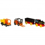 A működő daru és a villástargonca lehetővé teszi a rakomány fel- és lerakását. A gyerekek gyakorolják a finommotorikát és saját építkezéses történeteket alkotnak.