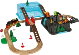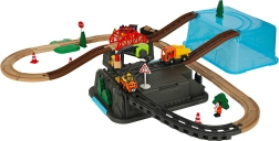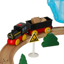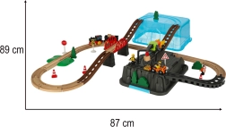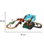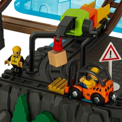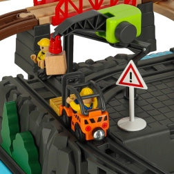 Ez az átfogó fa vasútépítő készlet a közlekedés és az építkezés lenyűgöző világát hozza el a gyerekeknek. Az elemekből tagolt pályát építhet, emelkedőkkel, amelyen a fa mozdony magától halad. Az építkezés témájú elemek – daru, villástargonca, bóják és táblák – valósághű jelenetet teremtenek és nyitott végű játékra hívnak.