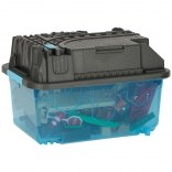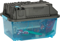 A masszív, kék doboz játék közben a pálya elemét alkotja, játék után pedig praktikus tárolóként szolgál. Minden alkatrészt egy helyen tart.