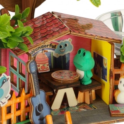 A precíz fa kivágások könnyen kipattinthatók és stabil házikóvá illeszthetők. A mellékelt festékek és ecsetek egyedi személyre szabást tesznek lehetővé.