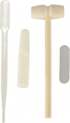 fa elemek, matricák, növekedési napló, kötél, műnövények, fa kalapács, cseppentő, 4 állatfigura, festékek, 2× ecset, 3× műanyag tálka