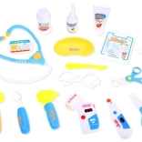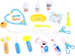 Sztetoszkóp, hőmérő, otoszkóp, vérnyomásmérő, fecskendő, olló, szike, szemüveg és további kiegészítők – minden, ami a teljes orvosos játékhoz szükséges.