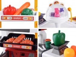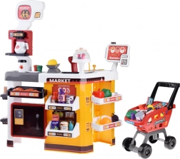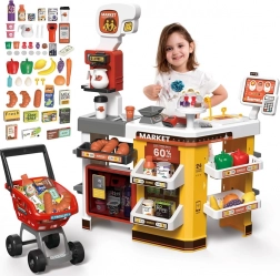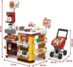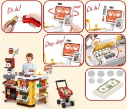 A gyerek szupermarket teljes játékkészlet, amely számos szórakoztató elemet tartalmaz. Cukrászdával, kávéfőzővel, hűtővel és bevásárlókocsival felszerelt, ez a játékkészlet igazi szupermarketet utánoz. A pénztár működőképes, valódinak tűnő hangokat és fényeket ad ki, ami fokozza a játék hitelességét. A még nagyobb élmény érdekében világított hűtő van ködimitációval, akárcsak az igazi fagyasztókban.