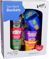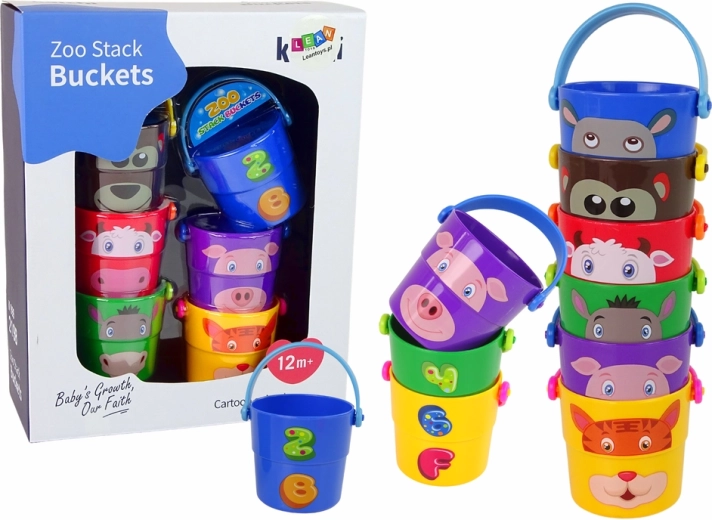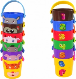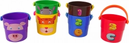 Ezek a különböző színű vödrök állatkák hasonmásait ábrázolják, mint például medve, tigris vagy tehén, ami lehetővé teszi a gyermeked számára az állatok különféle fajtáinak megismerését. A vödrök alján lévő különböző alakú nyílások révén a gyerekek különféle vízáramlatokat figyelhetnek meg, ami lenyűgöző élmény a kis megfigyelők számára. További lehetőségként a gyerekek vödrökből álló piramist építhetnek, ami fejleszti a gyerekek ügyességét és térbeli képzeletét.