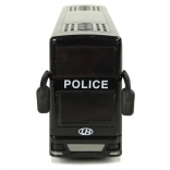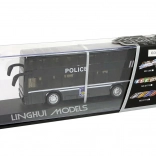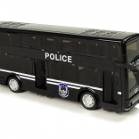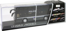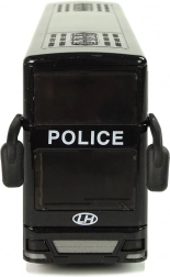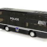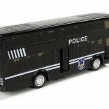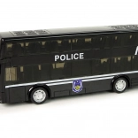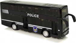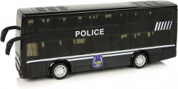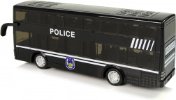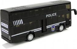 Fekete, kétszintes rendőrségi busz gyerekeknek, amely súrlódásos (pull-back) meghajtással, fény- és hangeffektekkel, valamint részletes belső kidolgozással érkezik. A gumibroncsoknak köszönhetően a haladás egyenletes, a POLICE feliratok és emblémák pedig vonzó megjelenést adnak. Ideális játék a koordináció és a képzelőerő fejlesztéséhez, és remek ajándék a átlátszó díszdobozban.