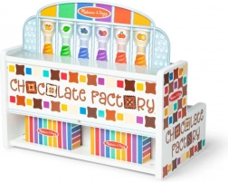 Ez a színes fa szett egy miniatűr „csokigyárat” jelenít meg, ahol a gyerekek cukrászt, eladót és vásárlót is eljátszhatnak. A szerepjáték fejleszti a szókincset, a kommunikációt és az önállóságot. A masszív fa kivitelnek köszönhetően a játék tartós és alkalmas a mindennapos használatra.
