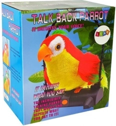 Hogyan kezdj játszani a színes papagájjal? Nagyon egyszerű! Nyomd meg a gombot az ág középső részén, amelyen ez a huncut állat ül, és amint felgyullad az LED fény, beszélj vagy énekelj. Néhány másodperc múlva a papagáj kétszer megismétli a szavaid, ami biztosan megnevettet. Ha újabb szavakra akarod tanítani a papagájt, nyomd meg újra a gombot. Az interaktív játék néhány másodperc tétlenség után, amikor nem hall szavakat, automatikusan kikapcsol. A vidám utánzást szárnymozgások kísérik – próbáld ki még ma.
