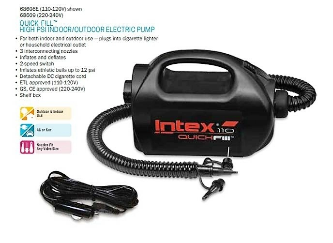Az univerzális Intex Quick-Fill elektromos pumpa felgyorsítja a matracok, medencék, csónakok és egyéb felfújható termékek előkészítését. A 12 V/230 V kettős tápellátás lehetővé teszi a használatát otthon és autóban, nyaraláskor vagy kempingezéskor. A kompakt ház praktikus fogantyúval és a hajlékony tömlő megkönnyíti a kezelést.