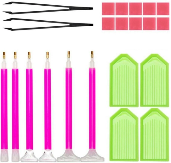 22 darabos kiegészítő készlet gyémánt hímzéshez/festéshez (gyémántfestés). Teljes készlet a gyémántmozaikkal való kaland megkezdéséhez. A készlet 6 tollat kézi fejekkel, 2 csipeszt, 4 gyémánttálcát és 10 négyzet viaszt tartalmaz.
