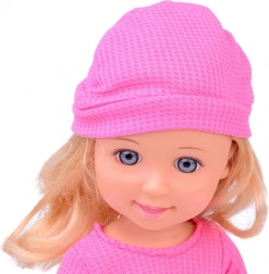 A rózsaszín blúz, lila szoknya és rózsaszín sapka elegáns megjelenést kölcsönöz a babának, ideális a divatjátékoz.