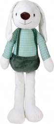Aranyos, 60 cm magas plüss nyuszi csíkos pólóban és zöld kantáros nadrágban, amely örömet szerez minden gyermeknek. Kivételesen puha, selymes anyagból készült, hímzett orrocskával, biztonságos műanyag szemekkel és barátságos mosollyal – ideális ölelgetéshez, játékhoz és alváshoz.