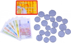 Nyitható pénztárfiók, euróérmék és bankjegyek, valamint bankkártya a pénzügyi tudatosság és a fizetési módok elsajátításához.
