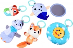 Függeszthető kisállat-készlet csörgőkkel, susogó részekkel, biztonságos tükörrel és dallamos napocskával a baba látásának, hallásának és tapintásának fejlesztéséhez.