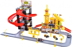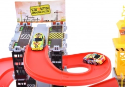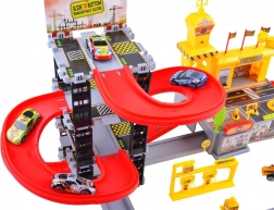 A többszintes garázs piros csúszdaszerű rámpákkal lehetővé teszi az autók folyamatos lejtmenetét és a dinamikus játékot. A parkolóhelyek és a bejáratok támogatják a valósághű forgalmat.