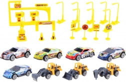A csomagban 5 személyautó, 3 építőgép és közúti jelzések találhatók. A gyerekek teljes világot építhetnek parkolóval, benzinkúttal és útelemekkel.