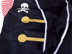 A szett mindent tartalmaz, amire egy kis kalóznak szüksége lehet: biztonságos műanyag kard, összecsukható távcső a „fedélzeti őrséghez”, szemkötő és kényelmes kalap. A jelmez könnyen felvehető és kényelmes viselet, hogy a gyerekek hosszú órákon át élvezhessék a játékot.