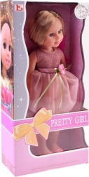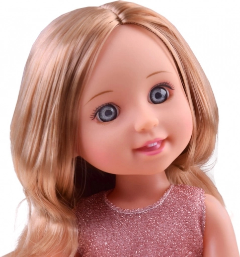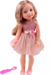 Elegáns baba minden kislánynak, sok pozitív szórakozást nyújt. A 36 cm magas baba hosszú szőke hajú. Világos rózsaszín koktélruhát visel, a lábán szandált és zoknit. A baba teljesen műanyagból készült, ezért stabilan ül. Mozgatható karjai és lábai vannak. Ezzel a divatos öltözékkel bálba vagy teapartira is elmehettek.
