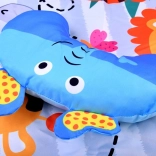 Színes illusztrációkkal és függő játékokkal ellátott puha szőnyeg biztonságos és szórakoztató környezetet biztosít a gyermekek számára.