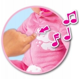 A pocak enyhe megnyomására nevetés, gügyögés, cuppogás és megnyugtató altatódal hallható. Tökéletes az elaltatáshoz és a nappali játékhoz is.