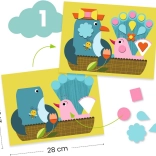A készlet tartalma: kollázs illusztrált lappal, előre kivágott vastag kartonlappal és ragasztótubussal; filc kollázs 12 lappal és 4 ív öntapadós filc elemmel; Color Stop 4 lappal, sablonnal és 4 színes ceruzával; vízfestés kártyával és varázstollal; színek felfedése 3 kártyával varázsbevonattal; kaparókép 3 kártyával és fa eszközzel; valamint áttekinthető képes útmutató.