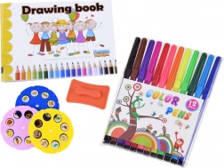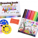 A csomag 3 dia készletet tartalmaz állatokkal, gyümölcsökkel és járművekkel, 12 színes filctollat, jegyzettömböt, alátétet és szivacsot – hosszú órákon át tartó alkotáshoz.