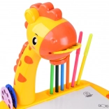 A bájos, zsiráf alakú rajzvetítő sablonokat vetít papírra, asztalra vagy falra, így a gyerekek könnyedén átrajzolhatnak és festhetnek. A csomag része egy rajzasztal, 12 filctoll, 3 dia készlet (állatok, gyümölcsök és zöldségek, járművek) és praktikus tartók a kiegészítőknek – ideális a kreativitás és a finommotorika fejlesztéséhez.