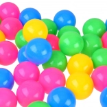 A labdák különböző élénk színekben érkeznek, mint például kék, sárga, rózsaszín és zöld, amelyek magukra vonzzák a gyerekek figyelmét.
