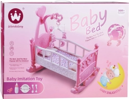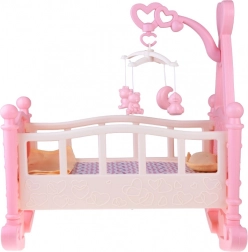 A teljes játék szett egy bölcsőt és elengedhetetlen kiegészítőket tartalmaz a babaápoláshoz.