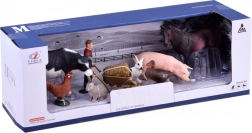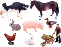 Ez a készlet autentikus farmélményt nyújt a gyerekeknek. A valósághűen megformált figurák – tehén, ló, malacka, nyúl, kacsa, tyúk és nyuszi – mellé egy gazda figurája talicskával társul. A kézzel festett részletek és a kellemes méretek segítik a kényelmes fogást és a hosszan tartó szórakozást.