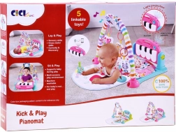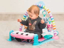 A szőnyeg puha, könnyen tisztítható, a színes minták és a biztonságos függő játékok ösztönzik a látást és a képzelőerőt. A kétfokozatú hangerőszabályzás és a zongora több üzemmódja (billentyűhangok és nyugtató dallamok) kényelmes használatot biztosít nappal és este is.