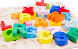 A fa beillesztős kirakó betűkkel egyesíti a szórakozást és a tanulást. Minden betű színes, jól megfogható és biztonságos a kicsik számára, ami ösztönzi az önálló játékot és a türelmet. Ideális az ábécével való első ismerkedéshez és a motoros készségek fejlesztéséhez.