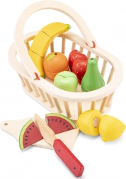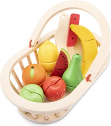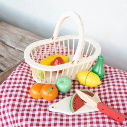A szett tartalma: vágódeszka, biztonságos fa kés és változatos gyümölcsválogatás: dinnye, eper, körte, alma, citrom, banán és narancs. Mindez masszív fa kosárban, amely könnyű tárolást és boltos szerepjátékot is lehetővé tesz.