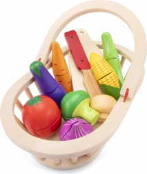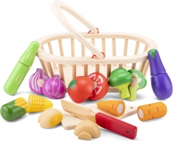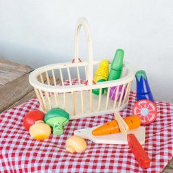 A készlet tartalmaz egy kosarat a könnyű tároláshoz és hordozáshoz, egy vágódeszkát és egy fa kést. A színes zöldségek – paradicsom, répa, brokkoli, padlizsán, hagyma, kukorica, gomba és uborka – játékosan ösztönzik a felfedezést és az egészséges étkezésről való tanulást.
