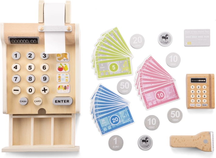 A pénztárgép nyitható fiókkal, szkennerrel, kártyaolvasóval van felszerelve, és tartalmaz 30 papír bankjegyet, 8 fa érmét és egy hitelkártyát – mindent, amire egy kis boltosnak szüksége lehet. 100% FSC tanúsítvánnyal rendelkező fából készült. Támogatja a korai matematikai és logikai megértést. Fejleszti a szociális és elbeszélő készségeket. Ösztönzi a képzeletet és a szerepjátékot, amely segít a gyerekeknek jobban megérteni a világot.