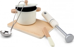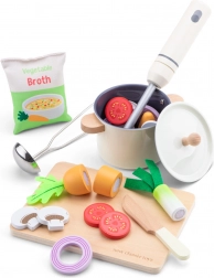 A fém lábosnak köszönhetően a gyerekek „megfőzhetik” levesalkotásaikat, akár az igazi séfek. A készlet tartalmaz egy fából készült botmixert az összetevők könnyű turmixolásához. Nem hiányzik a fém merőkanál a tálaláshoz, a biztonságos kés a szeleteléshez és a fa vágódeszka sem. A színes zöldségek életet visznek a játékba, és az egész készlet ideális kiegészítője bármely gyerekkonyhának. A főzősdi végtelen órányi szórakozást és felfedezést kínál a legkisebbeknek. Jó étvágyat!