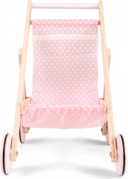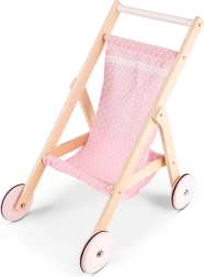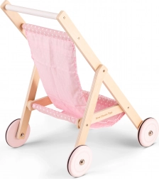 Ez a stílusos, fából készült babakocsi a természetes anyag tartósságát ötvözi a finom rózsaszín textil részletekkel. Stabil, könnyen kezelhető, és a kerekeken lévő gumigyűrűknek köszönhetően rendkívül csendesen gurul – lakásba és gyerekszobába egyaránt ideális. Az 50 cm magas tolókar kényelmes használatot biztosít az óvodásoknak.