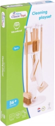 A készlet része egy felmosó, seprű, portörlő, tisztítókendő, lapát és kisdöfike. A gyermekek az összes eszközt ugyanúgy használhatják, mint a felnőttek.