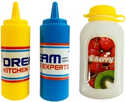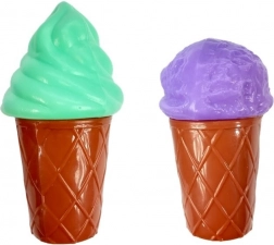 Két színes fagylalt és három „szószos” flakon ösztönzi a gyerekek fantáziáját az ízesítés és a tálalás során.