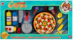 Ezzel a gazdag készlettel a gyerekek kipróbálhatják a kedvenc gyorsételek elkészítését és tálalását. A pizzát levehető, tépőzárral összekapcsolt szeletek alkotják, így együtt marad, ugyanakkor a mellékelt vágóval könnyen „felszeletelhető”. Nem hiányzik a tálaló lapát, az evőeszközök, a tányérok és két műanyag fagylalt sem desszertnek. A játék fejleszti a finommotorikát, edzi a koordinációt és társas készségeket alakít ki a közös étkezés során.