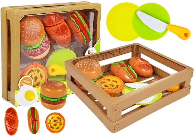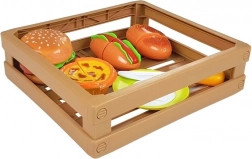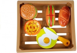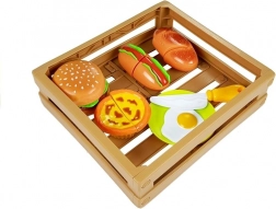 Játékkészlet kis szakácsoknak hamburgerrel, hot doggal, tojással és további finomságokkal, tépőzárral összekapcsolható elemekkel, praktikus ládában. Fejleszti a finommotorikát, a kreativitást és a szerepjátékot. Biztonságos műanyag elemek, ideális 3 éves kortól.