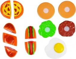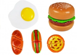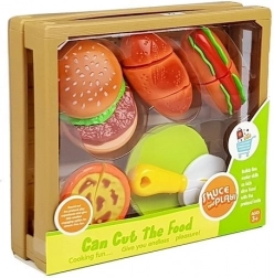 Ez a színes vágó készlet remek kiegészítő a gyerekkonyhába és a boltos játékhoz. Az elemek tépőzárral kapcsolódnak, így az ételek a mellékelt biztonságos késsel „vághatók”, majd újra összeilleszthetők. A gyerekek készíthetnek hamburgert, hot dogot, tükörtojást, vagy tálalhatnak édes homoktortát a tányérokra.