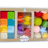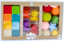A puha oktató fürdőkockák egy innovatív készlet, amely 20 élénk színű gumidarabot tartalmaz. Mind a nyolc kocka egyedi tulajdonságokkal rendelkezik, amelyek segítik a kognitív képességek fejlesztését a gyermekek számára. A különböző formákkal és domborzatokkal a kockák széles körű konstrukciókba köthetők össze, ami szórakoztató módon edzi a kézügyességet és kéz-szem koordinációt.