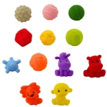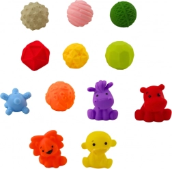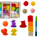 A készlet különféle formákat, állatokat és színes textúrákat tartalmaz, amelyek serkentik az érzékszervi fejlődést a gyermekeknél.