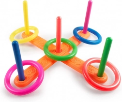 A sima élű, tartós műanyag biztonságos játékot és hosszú élettartamot garantál. A stabil pálcákkal ellátott kereszttalp és a könnyű karikák könnyen összeállíthatók és elpakolhatók. Az élénk színek segítik a színek megismerését, az egyszerű pontozás pedig további próbálkozásokra ösztönöz.