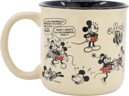 A bögre klasszikus, képregény stílusú Mickey egér illusztrációkkal díszített, amelyek nosztalgiát és Disney-varázst keltenek.